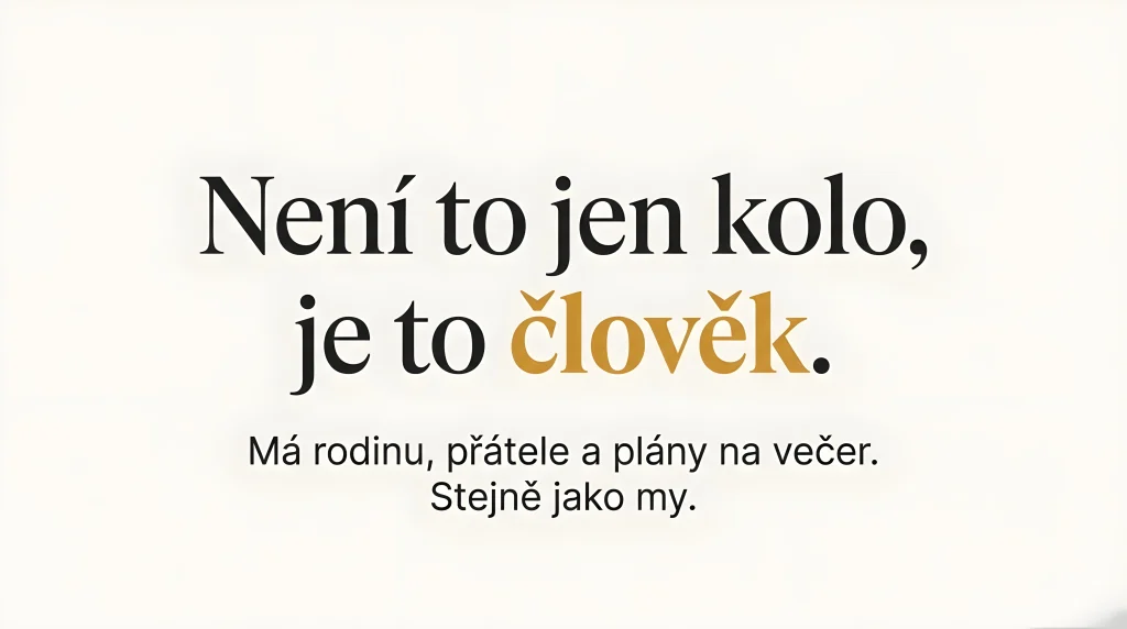 Cyklista nevidí za sebe a neslyší auto kvůli větru. Když ho těsně míjíte, lekne se dřív, než vás zaregistruje. Jedna chyba, jeden reflex – a následuje pád. Léčení, problémy v rodině a práci, další návštěvy u lékaře a policie. Metr a půl není prázdný prostor. Je to životní rezerva.