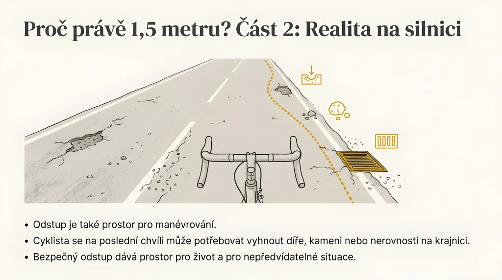 Krátké čekání při předjíždění, často jen pár sekund, se opravdu vyplatí. Poskytnutím odstupu 1,5 m se výrazně snižuje riziko vážného zranění nebo dokonce zabití cyklisty, riziko trestního stíhání, soudů i vysokého odškodného, a především riziko celoživotních psychických následků. Cyklista není robot, který by jel po ideální dráze. Krajnice často obsahují výmoly, kanály, štěrk nebo spadané větve. Bez dostatečného odstupu může cyklista náhle uhnout a ocitnout se přímo pod koly vašeho auta. Dodržení 1,5 m dává cyklistovi prostor pro manévrování a řidiči klid a jistotu.