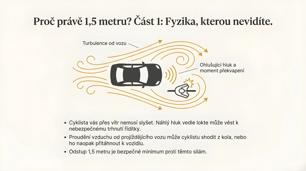 Dalším rizikem těsného míjení je, že cyklista se může leknout hluku motoru, ovlivní ho vzdušná turbulence od projíždějícího vozidla, která ho může přitáhnout k autu nebo naopak odhodit, a instinktivně strhne řídítka. Odstup 1,5 m eliminuje tyto nebezpečné situace.