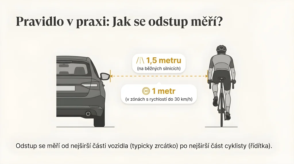 Nemusíte měřit centimetry. Stačí si zapamatovat jedno pravidlo: při předjíždění cyklisty si představte, že místo něj stojí auto. V praxi to znamená držet pravá kola auta alespoň na středové čáře. Pokud v daném místě není možné bezpečně předjet, je lepší počkat na vhodnější úsek. Zákon navíc umožňuje při předjíždění přejet jednoduchou plnou čáru, pokud tím neohrozíte protijedoucí vozidla.
