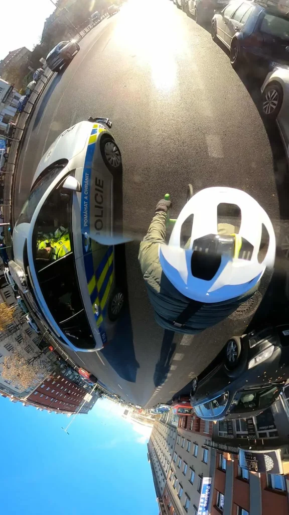 Aniž by se muselo přesně měřit, tak je jasné, že kolo a policejní auto se do jednoho jízdního pruhu o šířce 3.6 m nevejdou. 2 m auto + 1,5 m odstup + 80 cm cyklista > 3.6 m