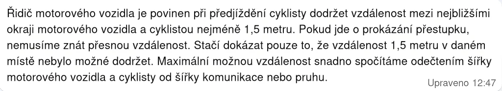 Povinný boční odstup není namířen proti řidičům. Je to jednoduché pravidlo, které snižuje riziko vážných nehod, chrání řidiče před právními následky a pomáhá, aby se motoristé i cyklisté dostali bezpečně domů.